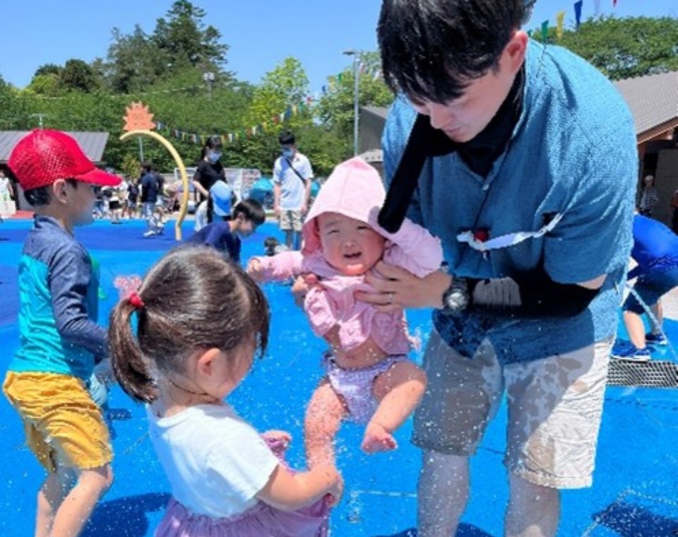 休日は子どもと過ごすようにしています。にぎやかな家庭を望む妻の意向もあり、この少子化のご時世において、わが家は娘3人。最近では、長女が三女の面倒を見るなどお姉さんぶりを発揮しているのを目にし、子どもの成長スピードを実感しています。写真は、近所の公園に水遊びに行ったときのもの。こうした何気ない休日が、仕事へ向かう活力につながっています。